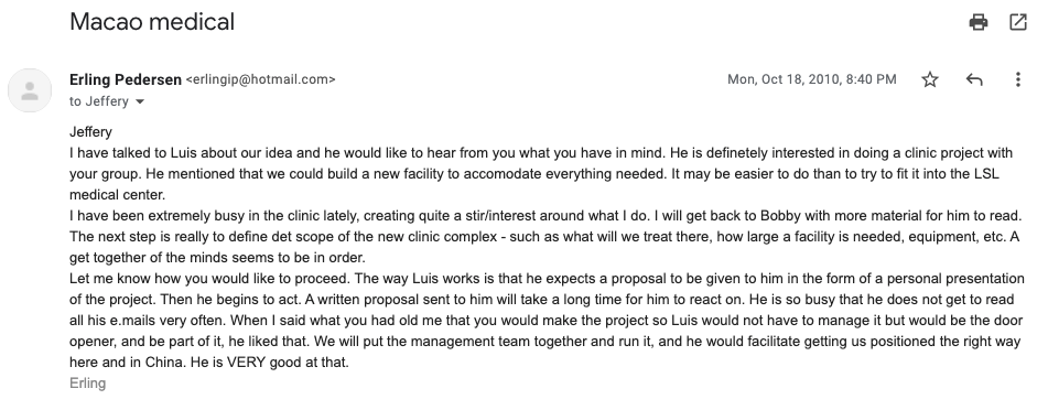 I have solid contacts and email proof to back up these claims. Pay attention to the language in Erling’s emails; he even capitalizes “VERY” as a subtle signal, a wink to insiders that “Luis is powerful and can get anything approved.” On paper, Luis only owned a small Chinese restaurant, a travel agency, and a hair salon. But Erling’s tone made it clear: Luis was a powerhouse, and everyone in the loop knew it. No ordinary restaurant owner carries that kind of influence. You just have to read between the lines.