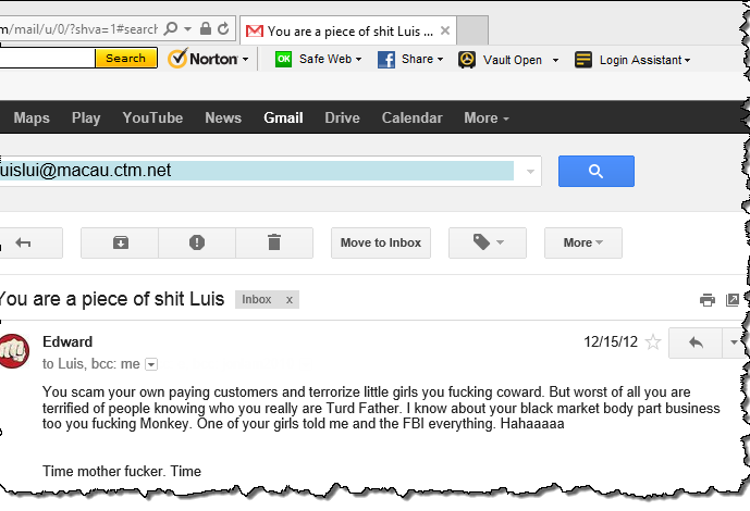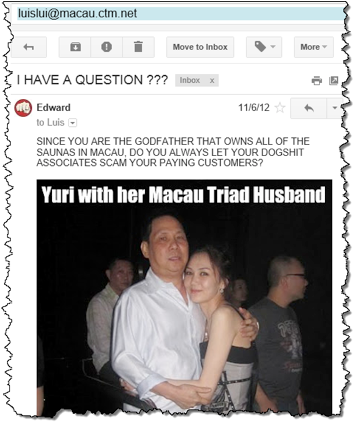 On November 6th, 2012, I made the decision to reach out directly to Luis Lui, just before I planned to publish my blog exposing him. My first email, shown on the left in the image below, got no response. I waited over a month before trying again, this time after speaking with the girl who confirmed and expanded on what I already knew. She told me outright that the Triads had initially planned to kill me, and that they threatened to kill my son if Hong didn’t cooperate. She also confirmed that the scam against me only moved forward after Luis Lui himself gave the green light; once they knew I had his business card, he said it was fine to target me since he didn’t know me or care who I was.